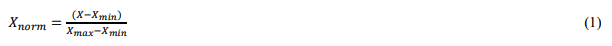 Normalization: Scaling the input data to a uniform range ([0,1]), for numerical stability and to avoid any feature from dominating due to differences in scales, the min-max normalization formula is in equation 1.