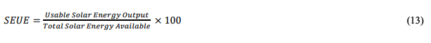 Solar Energy Utilization Efficiency (SEUE) measures how effectively a solar energy system converts available solar energy into usable energy. It is typically expressed as a percentage and calculated using equation 13.