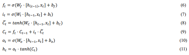 where 𝑥𝑡 is the input at time 𝑡, ℎ𝑡 refers to the hidden state, 𝐶𝑡 is the cell state, 𝑊𝑓, 𝑊𝑖 , 𝑊𝐶, 𝑊𝑜 are the weight matrices and 𝑏𝑓, 𝑏𝑖 , 𝑏𝐶, 𝑏𝑜 are the biased terms.