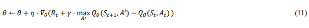 The DQL agent uses a neural network, ππ (ππ‘ , π΄π‘ ), to approximate the π-values, where π is trainable parameters. The agent learns from interactions with the environment (simulated or real agriculture) while exploring actions and their consequences during training. Then, network weights are updated with gradient descent as follows in equation 11.
