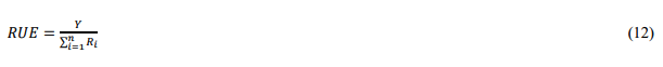 Resource Utilization Efficiency: It refers to the optimal use of resources, such as water, fertilizers, pesticides, energy, and the like, toward the highest possible crop production, minimizing waste or excess use of resources. Effective resource use in precision agriculture contributes to both sustainability and cost. High resource efficiency means that the input, water or fertilizer, should be applied in the best possible way so that maximum benefit can be derived with the least environmental damage. This can be expressed by the equation 12.