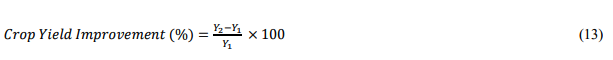 Crop yield improvement refers to the increase in the quantity of crops harvested per unit area due to improved farming methods, resource management, or technological advancements. Let π1 be the initial crop yield (baseline), π2 is the improved crop yield after implementing new methods and π₯π is the improvement in yield. The percentage improvement in crop yield is given by the equation 13.