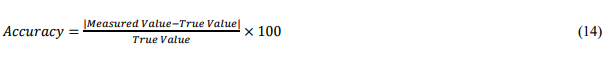 Data Accuracy and Precision: Data Accuracy refers to the measurements taken by sensors or monitoring devices compared to the actual values or ground truth (for example, soil moisture, temperature, humidity, crop growth). High accuracy is essential to making trustworthy judgments on precision agriculture interventions such as irrigation, fertilization, and pest control. Decisions based on low-accuracy measurements in the data may lead to under or over-fertilizing or incorrect irrigation, impacting crop yields and resource use. Data accuracy is calculated as in equation 14.