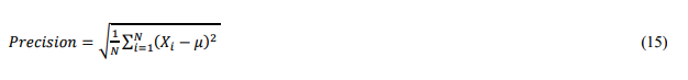 Data Precision shows the measurements' consistency or reproducibility, irrespective of their closeness to the true value. Precision is important to ensure that interventions (like water and nutrients) are applied consistently, resulting in predictable and controlled outcomes. High precision allows for more reliable decision-making because it indicates stable sensor performance. This can be calculated as in equation 15.