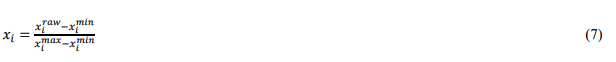 where π₯π represents the π-th feature and π is the total number of features. Using the formula, each feature is normalized to a common range (e.g., 0 to 1) to ensure consistency across different data scales in equation 7.