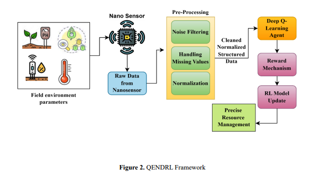 This innovative system optimizes agricultural processes such as irrigation, fertilization, and pest control. The QENDRL aims to increase crop efficiency and yield and decrease the overall environmental impacts through environmental nanosensors that are enhanced with quantum physics and deep Q-learning decision-making. QENDRL integrates advanced quantum nanosensors with reinforcement learning algorithms to facilitate robust, data-driven, and automated agricultural management. Quantum-enhanced nanosensors possess unmatched sensitivity and exactness in monitoring environmental and biological parameters, such as soil moisture, nutrients, and pests. This information is again used as real-time data for the Deep Q-Learning agent, which enhances optimization at every stage, given the circumstances faced by the agricultural specialists. Figure 1 shows the QENDRL framework.