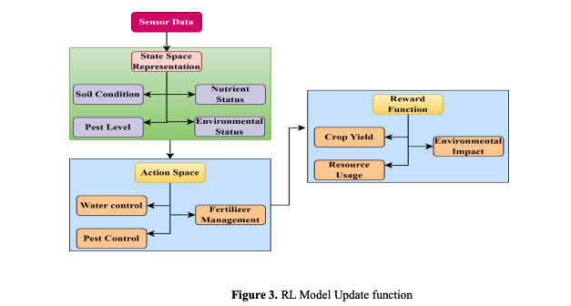 The problem statement of this study lies at the core of transcending the above limitations of conventional precision agriculture systems, which are too often plagued by either data latency or environmental sensitivity and resource optimization [9]. The currently practised approaches cannot dynamically respond to the changing conditions of fields, which often results in poor crop yield and resource utilization. However, most of the systems rely on static and predefined models that can't learn from the ongoing conditions and therefore can't adapt over time [10]. The present research tries to overcome these limitations by integrating quantum-enhanced nanosensors with AI-driven decisionmaking models, particularly Reinforcement Learning, in developing a system able to perform real-time adaptation and optimization in crop management. The next AI challenge is to develop a framework that can learn from the continues data inputs which will take dynamic and effective decisions for the irrigation, fertilization, and pest control [11].