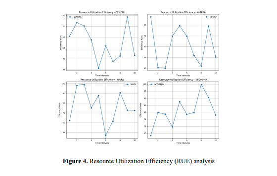Figure 4 illustrates the Resource Utilization Efficiency (RUE) of four different methodsβQENDRL, AI-NISA, NAIPA, and NFDMPHMβacross various time intervals. Each subplot represents the performance of one method, showing how efficiently resources (e.g., water, fertilizer, pesticide) are converted into crop yield over time. The x-axis denotes time intervals, while the y-axis represents the efficiency ratio (crop yield divided by resource input). The visualization shows that RUE fluctuations over time for every method, outlining the variability of performance as the growing season advances or as interventions are being done. For example, some methods, such as NAIPA, may generally have higher efficiency ratios, indicating better resource management. In contrast, other methods may show no consistent pattern, pointing out areas for optimization. This comparative analysis gives important insights into which method consistently maximizes resource efficiency over time and supports decisionmaking for the most sustainable agricultural practices.