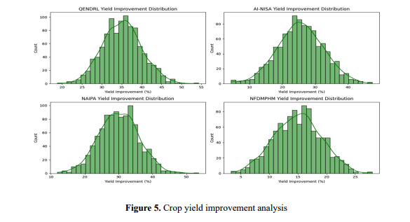 Figure 5 illustrates the distribution of crop yield improvement percentages for four methods: QENDRL, AI-NISA, NAIPA, and NFDMPHM. Among them, QENDRL achieves the highest mean yield improvement, centered around 35%, showcasing its superior performance and reliability. AI-NISA has a mean yield improvement of about 25%, while NAIPA reaches approximately 30%, both performing well but trailing behind QENDRL. NFDMPHM has the lowest mean improvement of around 15%, indicating limited effectiveness. The KDE curves further highlight QENDRL's dominance, with a concentrated and consistent yield improvement, making it the most effective method for enhancing crop productivity.
