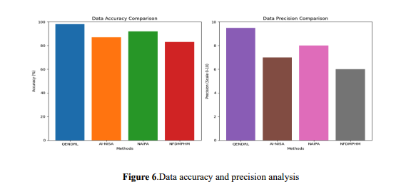 Figure 6 illustrates the comparative analysis of the QENDRL with conventional methods like AINISA, NAIPA, and NFDMPHM, revealing significant performance variations across accuracy and precision metrics. The data accuracy comparison demonstrates QENDRL's superior performance at approximately 95%, followed by NAIPA at 90%, AI-NISA at 85%, and NFDMPHM at 82%. Similarly, regarding precision (scaled 0-10), QENDRL maintains its leadership with 9.5, while NAIPA, AI-NISA, and NFDMPHM achieve 8.0, 7.0, and 6.0 respectively. The consistent ranking pattern (QENDRL > NAIPA > AI-NISA > NFDMPHM) across both metrics indicates QENDRL's robust performance advantage. This systematic outperformance by QENDRL suggests its enhanced capability in data processing applications where high reliability and precision are crucial, representing a significant advancement over existing methodologies