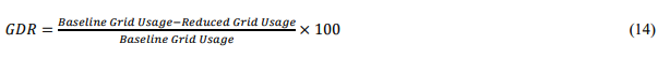 Grid Dependency Reduction (GDR): Quantifies the degree to which a solar energy management system succeeds in weaning dependency on the grid with solar energy and battery storage. It is usually expressed as a percentage and calculated using the equation 14.