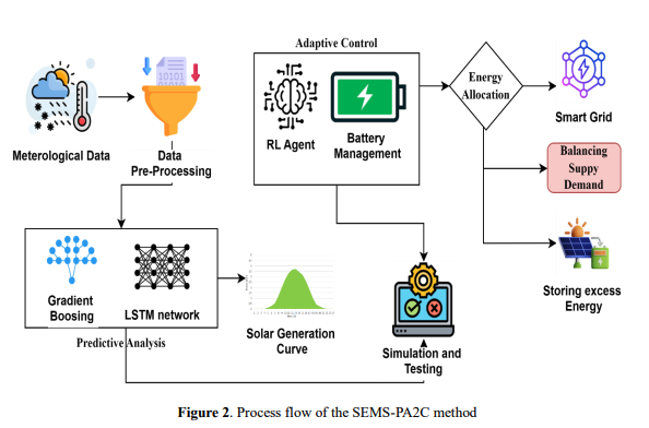 In sustainable energy systems, smart grids are important in seamlessly integrating power into the system from renewable sources including solar, wind, and hydroelectricity. Advanced energy networks like these address the key renewables-related challenges: intermittency. Using predictive analytics, smart grids level out the fluctuating energy outputs of solar and wind resources so that the energy supply always remains stable and reliable. Further, it has smart grids with smart control systems that optimize the energy storage solutions—batteries—storing surplus renewable energy during off-peak periods for use during high demand. Additionally, the smart grids allow decentralized energy generation by fostering microgrids, which promise to provide energy resilience and reduce dependence on centralized, fossil-fuel-based power plants. This assures effectiveness in transforming energy into a sustainable, environmentally friendly, renewable energy supply system. Figure 2 shows the process flow of the SEMS-PA2C method.