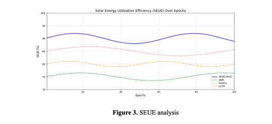Figure 3 compares SEUE among methods, SEMS-PA2C, ANN, GSMFS, and LSTM, over 100 epochs. SEMS-PA2C shows the highest SEUE, with values of approximately 90%, which indicates its strong optimization ability. The second highest is LSTM, showing a little lower efficiency but good performance in time-series prediction. GSMFS and ANN are moderate, with GSMFS outperforming ANN due to the optimization of feature selection. The oscillations represent adaptive behaviour over epochs, and SEMS-PA2C exhibits stable and consistent performance. This comparative analysis has brought out the effectiveness of SEMS-PA2C in maximizing solar energy efficiency, which certainly is a reliable approach for managing renewable energy systems in smart grids.