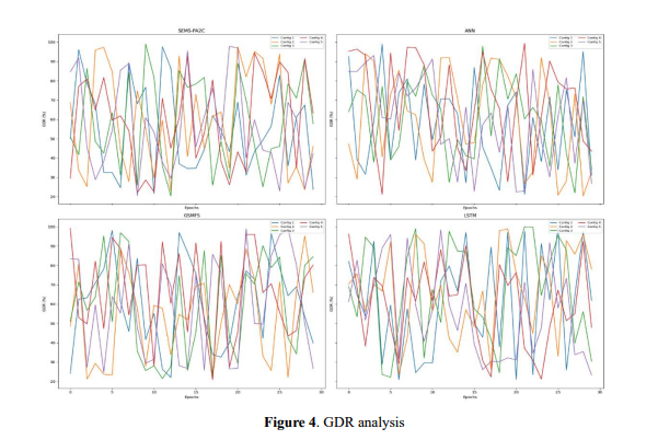 Figure 4 shows the GDR performance comparison among four methods, SEMS-PA2C, ANN, GSMFS, and LSTM, for 5 configurations over a range of epochs. There is one subplot for each technique. Hence, there are trends in GDR for all configurations. In this case, each line represents configuration, the xaxis represents epochs, and the y-axis represents the percentage of GDR. The performance of SEMSPA2C, ANN, GSMFS, and LSTM can be analyzed individually, showing variations in GDR across configurations. This setup directly compares each method's effectiveness in reducing grid dependence under different conditions. The legend shows the configurations, and the layout is such that it maximizes readability and ease of comparison.