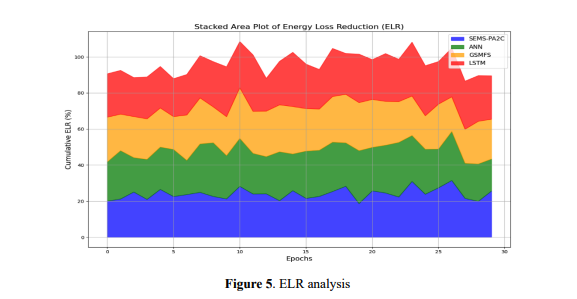 Figure 5 visualizes the cumulative Energy Loss Reduction achieved by four methods, SEMS-PA2C, ANN, GSMFS, and LSTM, over numerous epochs. In this line-up, each colourful segment shows a contribution of the method to the overall ELR. Their accumulation in the y-axis shows how ELR trends change concerning time on the x-axis. This figure points out each contribution to saving energy loss in an easily comparable manner. Its stacked design shows cumulative effect—therefore, easily pinpointing the methods that work consistently or start dominating at any of the epochs.