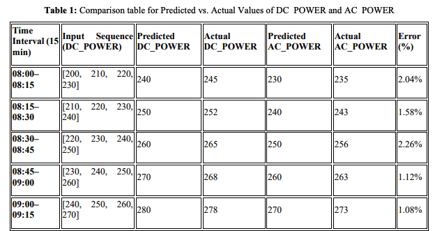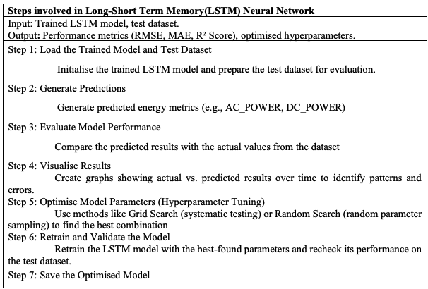 Energies projections for output (such as DC_POWER and AC_POWE R) are the primary emphasis of this module's LSTM Neural Network design and learning process. A combined amount of three subsetsβ 70% for training, fifteen per cent for confirmation, and 15% for testingβmake up the dataset. For instance, out of 10,000 entries in the dataset, around 7,000 are utilised for training purposes, 1,500 are reserved for validation, and 1,500 are used for testing. Examples of sequences created using windowsliding methods include predicting a subsequent energy value based on the last four time stamps (one hour). A compact output level, a layer that drops out, an input layer, and an invisible LSTM layer make up the LSTM model. Programs trained using optimisation algorithms such as Adam Optimization reduce the reduction in the function of Mean Squared Error (MSE). The model anticipates a value of 240 as the following Input if the ordering (DC_POWER) includes measurements such as [200, 210, 220, 230]. Training will continue to ensure that the model performs adequately on newly acquired information until its validation loss stabilises.