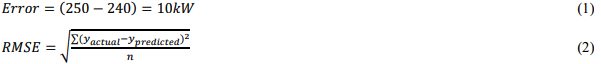 The model used by LSTM is assessed after learning. Important indicators of performance are computed, including. π 2 Score, Mean Absolute Error (MAE), and Root Mean Squared Error (RMSE). For instance, the power source inaccuracy is computed as follows: Error = (250 β 240) = 10 kW if the actual value is 250 kW and the projected π·πΆβππππΈπ is 240 kW.The error is calculated as: