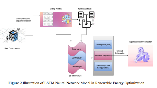 An LSTM Neural Network's process for forecasting energy amounts in renewable energy sources is shown in the design. The procedure begins with gathering data from many sources, such as energy systems and monitors. The next phase is to prepare this information, involving tasks like standardisation and selecting features. All three layers of the LSTM model architectureβthe Input, the LSTM, and the Denseβare responsible for sequence simulation. Training Data (MSE) is used to train the model, while Validating Data (RMSE) is utilised to verify it. Future cost of energy estimates are established. The last stage is to optimise and fine-tune the model to improve the precision of forecasts.