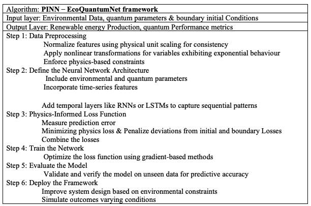 These findings suggest that PINNs, especially the PINN-EcoQuantumNet, can accurately model and reproduce quantum processes influencing renewable energy generation technology. Prediction and optimizing neural networks (PINNs) are highly effective at exploiting weather-related data, including humidity, wind speed, sun radiation, and wetness, since they include chemical principles in their neurons. Results indicate that electrical system efficiency estimations are more precise and accurate when applied to various contexts. In PINNs, models based on data are linked to structural values to understand complex ecological relationships better. Improving model generalization throughout multiple states locales, unique environmental aspects, and current knowledge sources are all potential areas for further development. Combining PINNs with other AI methods, such as reinforcement learning, could enhance adaptable energy planning even more. These developments have the potential to revolutionize the sector of renewable energy sources and significantly support global efforts for environmentally conscious innovation and conservation of the environment.