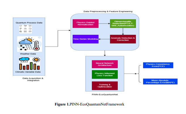 The EcoQuantumNet architecture ensures the best possible preparation with the least noise and duplication by collecting, cleaning, and integrating various renewable energy and environmental data types. The three primary sources of information required for this task are (1) Weather data (including air temperature, humidity, wind speed, solar radiation, and pressure) (2) Quantum process data (including measurements of quantum efficiency, photovoltaic material properties, and the operation of wind turbines under quantum-driven effects) (3) Climatic variable data (Collectively, geographic information includes topographical features that impact the dispersion of solar radiation and wind) and location-specific metrics like height, latitude, and longitude.
