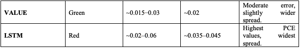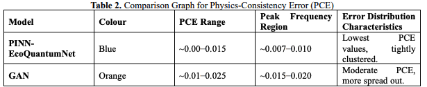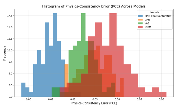 Utilizing the Physics-Consistency Error (PCE) statistical as a metric, the graphic following analyzes four models, drawing attention to the measurement error categories, peak sectors, and other essential features of each. Although LSTM displays the most significant number of distributed faults, PINNEcoQuantumNet has the fewest and most reliable abnormalities.