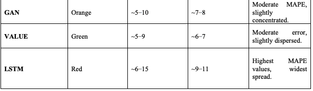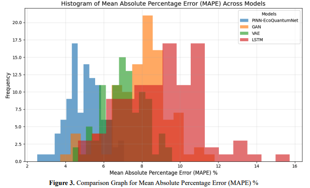 The code produces a histogram graph to evaluate PINN-EcoQuantumNet architecture to current frameworks (GAN, VAE, and LSTM) concerning Mean Absolute Percentage Error (MAPE). Synthetic MAPE values demonstrate these outcomes' differences; a reduced MAPE means a more precise forecast. The graphic indicates that the suggested framework can generate far greater precision predictions than conventional approaches.