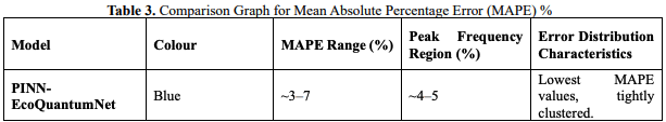 The accuracy of the predictions made by the EcoQuantumNet architecture is evaluated using the Mean Absolute Percentage Error, which compares the actual data with the projected values. It is easy to comprehend and compare with different datasets and scenarios since MAPE presents the mistake as a percentage. When the MAPE is decreased, the accuracy of the predictions is improved in situations such as renewable energy predictions.